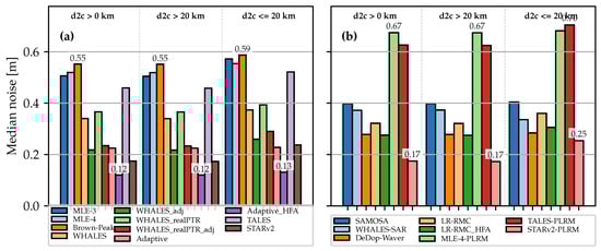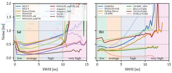 The column “Denoised” in Table 3 indicates whether a denoising technique was applied to the retracked dataset in order to decrease the noise content in the along-track SWH series. This could have been applied either implicitly within the retracking algorithms as for the STARv2 algorithm (as discussed in Section 2) or explicitly, a-posteriori to the retracked L2 dataset. Examples for explicit techniques are the intra-1-Hz adjustment [35] or high-frequency adjustment (HFA) [36], and an empirical mode decomposition (EMD)-based technique [37].