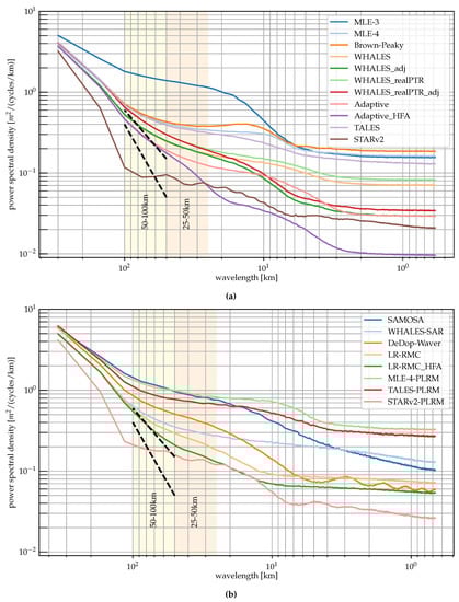 The interest here is in the perspective of mapping and monitoring applications, where the finest scale information may not be immediately useful, but the interest is in the correct characterisation of the variability at scales of 25–100 km. To assess such variability, we consider successive 1024-point sections of the SWH data (corresponding to ∼300 km along-track) and determine Fourier components using the Welch periodogram method. This method applies a Hann window to the data to mitigate the effects of any discontinuity between the values at the end of each section. As the analysis is achieved using fast Fourier transform (FFT), the data must be free from any missing values. To produce sufficient spectra for averaging, we utilise any segment that has less than 5% missing data and fill in the gaps with simple linear interpolation. We also adopt the procedure of calculating the spectra from sections commencing every 512 points along-track (i.e., 50% overlap), as the Hann weighting downplays the contributions from the outer edges of each section [58]. This analysis was deliberately constrained to data that was from the open-ocean (by setting a dist2coast > 20 km), free from land, or sea-ice (flag taken from the baseline products), so that the information derived is exclusively about the wave height field of that retracker rather than being affected by other phenomena.