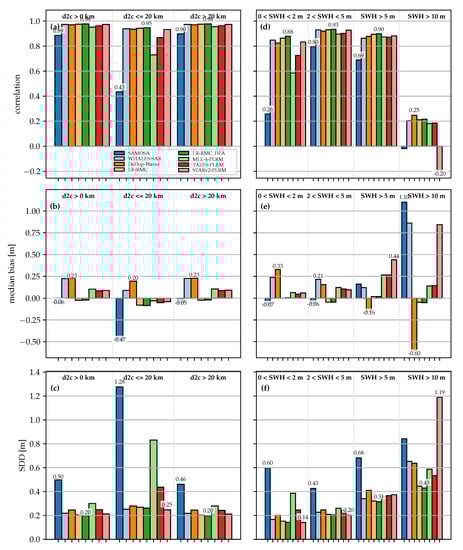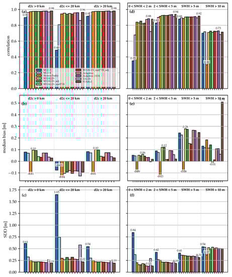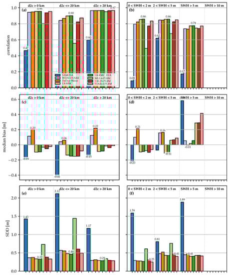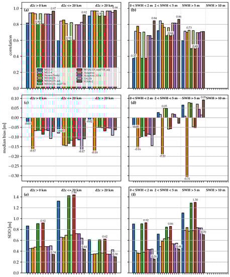 In order to objectively assess the performance of the individual retracking algorithms, the following five different types of analyses were evaluated: outliers, noise, wave spectral variability, and the comparison against a wave model and against in-situ data. All metrics from the analyses are generated as a function of the dist2coast and the sea state. The terms coastal and open-ocean are used for dist2coast values of less than or greater than 20 km, respectively, with the classification of sea states being as in Table 4.
