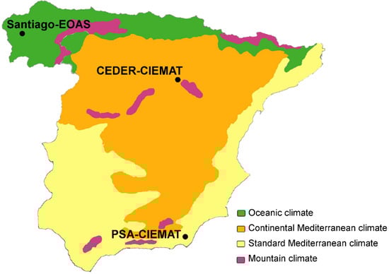 1. Santiago de Compostela (Santiago-EOAS) (42.88°N, 8.56°W, altitude 255 m a.s.l.) from January 1, 2016 until December 31, 2017. Located in the northwest of the Peninsula, it has a clear oceanic climate, characterized by continuous cloudiness and precipitation throughout the year and, therefore, by low solar activity regularly. In this location, the mean annual temperature is 13.7 °C and the annual precipitation is 1896 mm [45].
