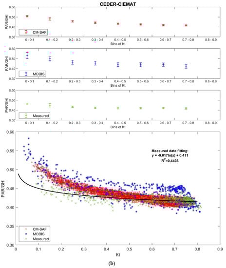 To check the degree of accuracy of the proposed models, they were applied at the three stations used in this work, for which we used PAR and GHI ground measurements. Figure 2 (PAR/GHI vs. kt) shows that we added the values provided by CM-SAF and MODIS for comparison with the values obtained from pyranometer measurements, as well as the plots of the error bars in bins of 0.1 kt. In the case of Santiago-EOAS, MODIS estimates showed behavior more similar to the ground measurements than CM-SAF estimates, as these last estimates more poorly captured the high dispersion observed in the ground data. On the other hand, the mean values were very similar for both satellite-derived datasets, although MODIS provided a better estimate for lower kt. At CEDER-CIEMAT, according to the mean values, MODIS usually overestimated more than CM-SAF, while CM-SAF was in good agreement with the ground measurements for values of kt higher than 0.5. According to the error bars, the spread obtained from CM-SAF estimates was less than that from MODIS estimates and more similar to that obtained from measurements. At PSA-CIEMAT, MODIS overestimated the dispersion of the measured data more than CM-SAF, the mean values of which were, in general, more similar to those of the ground measurements. The LUT approach used to obtain MODIS products can explain its worse performance for the Meditteranean case. Indeed, as explained, for this LUT, the atmospheric radiative properties were estimated by directly taking the satellite TOA signature. Therefore, the performance at the native resolution of the satellite data was obtained and, thus, fewer data gaps were produced, which improved the estimates. However, in zones where the contrast between TOA reflectance and surface reflectance is more limited, as in the Mediterranean case, the lack of discrimination can result in worse estimates.