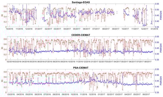 Due to the known relation between the PAR/GHI ratio and kt, the temporal variability of this ratio is also influenced by the temporal variability (by the minute, hour, day, etc.) of kt. In Figure 3 the temporal evolution of measured daily data of kt and PAR/GHI is plotted for the three study stations. The graphs show the high temporal variability of kt at all stations, while the PAR/GHI ratio remained more stable at the Mediterranean stations.