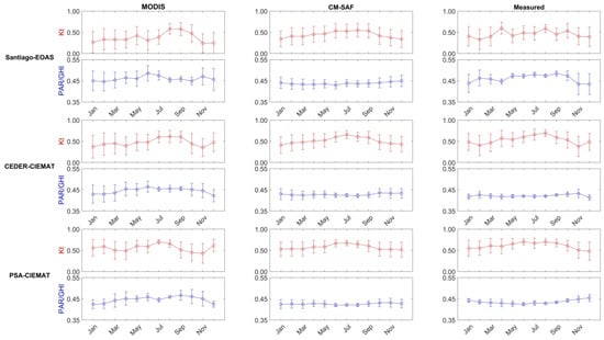 Additionally, the monthly evolutions of kt and PAR/GHI at the study stations determined by using the models obtained from both datasets are included in Figure 4, along with the corresponding evolutions of measured data. According to this figure, at the Mediterranean stations (CEDER-CIEMAT and PSA-CIEMAT) the monthly evolution of both variables was better captured by CM-SAF estimates than those from MODIS. However, in the case of the Santiago-EOAS station (oceanic climate), regarding the PAR/GHI ratio, MODIS behaved more similarly to ground measurements than CM-SAF did, due to the LUT approach used, which provided greater performance accuracy.
