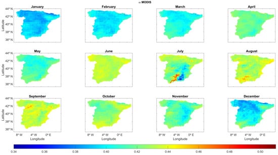 Figure 5, Figure 6, Figure 7, Figure 8, Figure 9 and Figure 10 show the coefficients α and β, that is, the model corresponding to each point of the study area and each month, from both datasets (CM-SAF and MODIS). Regarding the physical reading of α and β coefficients, α is the percentage of PAR in GHI and thus, it should be higher as kt decreases. While the β coefficient is an adjustment correction term. Figure 7 and Figure 10 show the determination coefficients (R2) for each point, indicating the degree of correlation existing between the satellite-derived PAR estimations and the model for this point. According to these figures, most of the determination coefficients were higher than 0.95, except in July for the MODIS-estimate-derived model, which had lower coefficients in a region of the center and south of the study area. Indeed, in these cases, the correlation between PAR and GHI (measured by the determination coefficient) is quite lower than in the rest of the cases. Thus, the coefficients α and β also showed very different values. MODIS performance characteristics could explain these anomalous results. As it was mentioned, MODIS accuracy to estimate radiation may be compromised in clear sky conditions, so the relation between PAR and GHI could not be captured properly during July in the south and center of mainland Spain.
