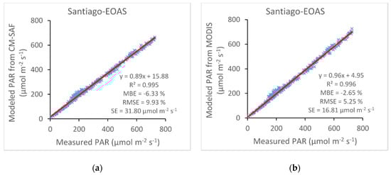 Scatterplot of measured PAR and modeled PAR (blue cross) corresponding to the Santiago-EOAS station. The fitting line is represented in red and the statistics of the fitting are also included. (a) CM-SAF-estimate-derived model; (b) MODIS-estimate-derived model.
