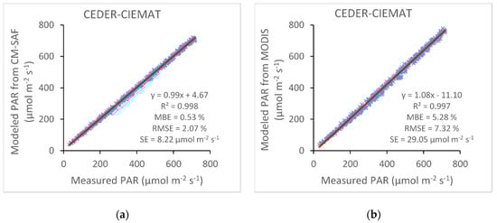 Scatterplot of measured PAR and modeled PAR (blue cross) corresponding to the CEDER-CIEMAT station. The fitting line is represented in red and the statistics of the fitting are also included. (a) CM-SAF-estimate-derived model; (b) MODIS-estimate-derived model.