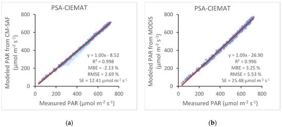 Scatterplot of measured PAR and modeled PAR (blue cross) corresponding to the PSA-CIEMAT station. The fitting line is represented in red and the statistics of the fitting are also included. (a) CM-SAF-estimate-derived model; (b) MODIS-estimate-derived model.