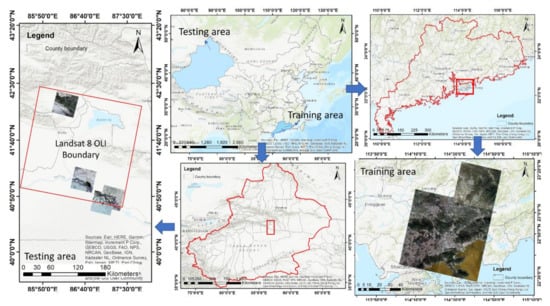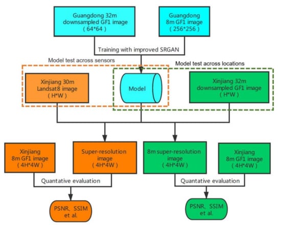 - We test the performance of the ISRGAN from two sensors (Landsat 8 OLI and Chinese GF 1) at different locations (Guangdong and Xinjiang in China). Specifically, for the cross-location test, the model training in Guangdong with the Chinese GF 1 data was tested with the GF 1 data in Xinjiang. For the cross-sensor test, the same model training in Guangdong with GF 1 was tested with the Landsat 8 OLI data in Xinjiang;