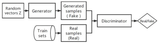 The GAN is a deep learning model proposed by Goodfellow et al. [30] in 2014. The structure of the GAN is inspired by the two-person zero-sum game in game theory. The framework consists of a generator (G) and a discriminator (D), where the generator (G) learns the distribution of real sample data and generates new sample data, and the discriminator (D) is a binary classifier used to distinguish whether the data is from real samples or generated samples. The structure diagram of the GAN is shown in Figure 2. The optimization process of the GAN is a minimax problem. When the generator and discriminator reach the Nash equilibrium, the optimization process is completed.