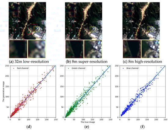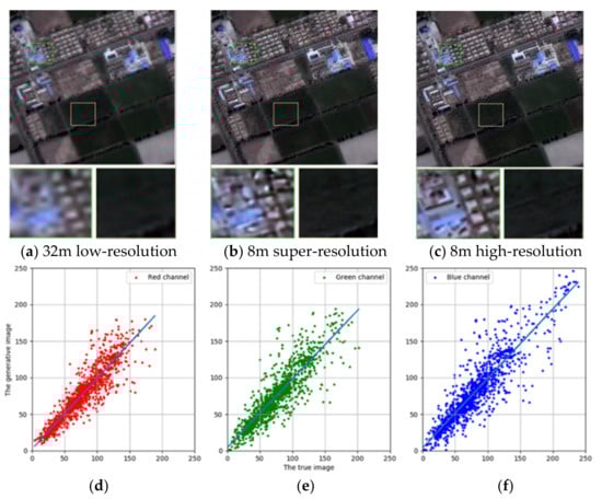 Cross-sensor and -location comparison: the predicted super-resolution image for our ISRGAN model (b) on a Landsat 8 dataset in Xinjiang, compared to the input image (a) and the ground truth (c). Figures (d), (e), and (f) are 1:1 plots of the DN value in the red, green and blue bands compared to the ground truth (c), with slopes of 0.9527, 0.9564 and 0.9760, respectively.