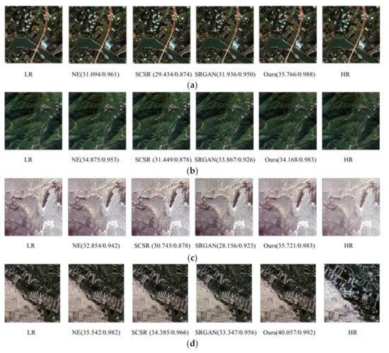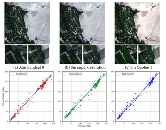 In recent years, with the rapid development of artificial intelligence, especially neural network-based deep learning methods, deep learning has been widely applied in the field of computer vision, due to its obvious advantages for nonlinear process fittings of large samples. One benefit of these models is their ability to handle large sample sets while retaining a good generalization ability. In the field of image super-resolution, the super-resolution CNN model (SRCNN) was first presented by Dong [25] in 2014. Compared with traditional image super-resolution, this method achieves a higher peak signal-to-noise ratio, but when the image on the sampling ratio is high, the reconstructed image will be too smooth, and details will be lost. To overcome this shortage, a super-resolution generative adversarial network model (SRGAN) was presented by replacing the original CNN structure with the generative adversarial network (GAN) [29]. As the newest learning model from the deep learning field, the SRGAN shows many advantages for capturing high-dimensional nonlinear features over large samples. However, the generalization ability of the SRGAN model in remote sensing images across different locations and sensors remains unknown.