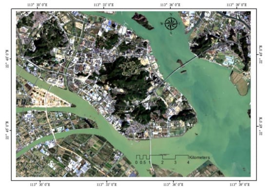 The classification area selected was in the area at the border of Guangzhou and Shenzhen, where the feature categories are rich and densely distributed. It is beneficial to fully take advantage of high spatial resolution images in the land use classification and feature extraction. As shown in Figure 8, the original Landsat 8 image of the super-resolution application sample area was obtained on February 7, 2016.