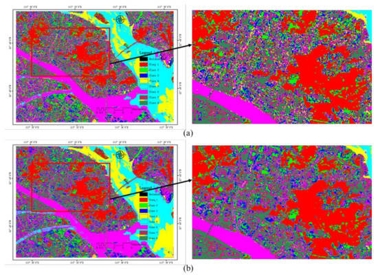 Comparison of the classification results between the images before and after super-resolution. Figure (a) is the classification result on the image before super-resolution and Figure (b) is the classification result on the image after super-resolution.