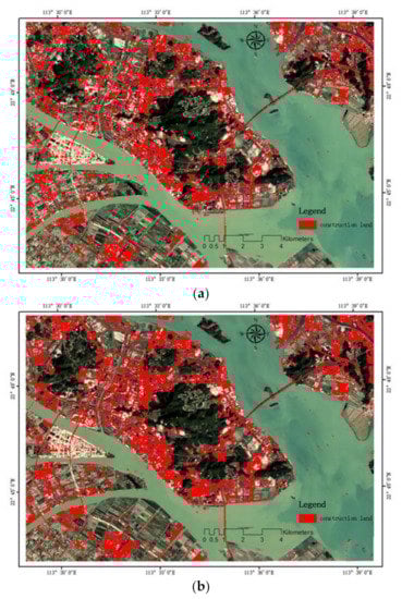 In addition, in order to better reflect the superiority of the image after super-resolution on the extraction of impervious surfaces, we used the Support Vector Machine (SVM) algorithm to extract impervious surfaces based on images before and after super-resolution. Similarly, in order to minimize the influence of human factors on the extraction results, we randomly selected the same set of training samples and test samples on Google Earth, converted them into the area of interest at the corresponding resolution, and then classified and extracted them. The extraction results of the impervious surfaces before and after super-resolution are shown in Figure 10.