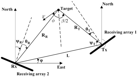 In Figure 1, the transmitter and receiving array 1 are deployed at the transmitting station (Tx), while receiving array 2 is deployed at the receiving station (Rx). The transmitter serves the two receiving arrays simultaneously. The distance L between the transmitter and receiver is called the bistatic range or simply the baseline. denotes the angle between the baseline and East direction. Denote and , respectively, as the radar look directions of receiving array 1 and receiving array 2 with respect to true North. is the bistatic angle. For a moving target with a velocity of magnitude V and aspect angle referenced to the bistatic bisector, the monostatic radar represents a target as a plot with a state vector in a polar coordinate, with , , being the range, azimuth, and Doppler velocity measured at the transmitting station. Similarly, the bistatic radar represents a target as a plot with a state vector , with , , being the range, azimuth, and Doppler velocity calculated at the receiving station. As the estimation methods of , , and for monostatic HFSWR has been investigated [11], only the estimation methods of , , and for the bistatic HFSWR are discussed here.