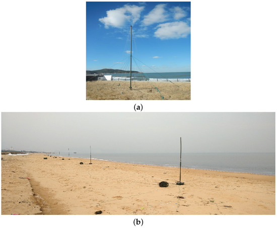 Transmitting antenna and one receiving antenna array of the developed T/R-R compact HFSWR system. (a) Transmitting antenna installed at Weihai radar station. (b) One receiving antenna array.