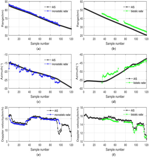 The range data, azimuth data, and Doppler velocity data sequences corresponding to the four track segments are compared with those obtained by the AIS track projections, the results are shown in Figure 6. Figure 6a,c,e illustrate the range, azimuth, and Doppler velocity comparison results of the monostatic radar, respectively. The corresponding comparison results of the bistatic radar are shown in Figure 6b,d,f, respectively. The Sample number denotes the sequence number of a plot in a track.
