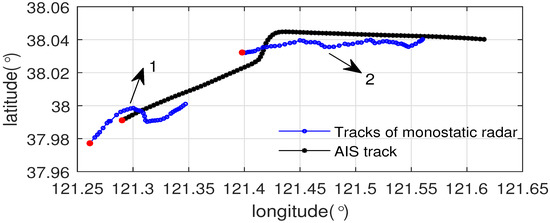 As a Doppler radar, HFSWR favors detecting targets that have significant velocity projection components along its radial directions. The track of target 2 can only be produced from the monostatic radar data as it sails nearly along the tangent direction of the isorange ellipse of the bistatic radar. The obtained two track segments, marked as ‘1’ and ‘2’, and the matched AIS track are illustrated in Figure 8. The durations of these two track segments are 11:52 a.m.–12:28 p.m. for track segment 1 with 37 plots, 12:40–1:33 p.m. for track segment 2 with 54 plots. The duration for the matched AIS track is from 11:52 a.m. to 1:33 p.m. with 102 plots.