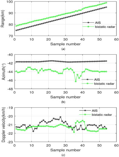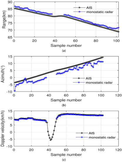 The comparisons of the corresponding range data, azimuth data, and Doppler velocity data sequences are shown in Figure 9. It is observed that both the range data and Doppler velocity data sequences agree well with those of the AIS projection results with RMSEs of 1.37 km, and 0.36 km/h, respectively, which are similar to the results obtained by the monostatic radar for target 1. However, the accuracy of the azimuth data sequence is a little worse with an RMSE of 2.66 due to the target’s longer distance from the radar site, which leads to large target position deviations from its true trajectory. It can be seen from Figure 9c that the Doppler velocity changes from positive values to negative ones, and then becomes positive again around the 40th plots. This is because that target 2 moves nearly along the tangent direction of the Weihai radar. At some locations, its Doppler velocity becomes nearly zero and thus it is difficult to be detected. The missed detections may lead to the track fragmentation. However, the tracking algorithm adopted here has not been considered such situations.