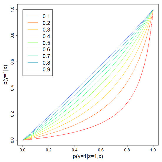Equation (11) reveals how probability estimates based on the CC data can be converted to the unbiased probability estimate (i.e., estimates that one would obtain from a random sample of the data). Assuming , Figure 1 shows the relationship between these probabilities given by Equation (11) for different values of . As expected, this figure reveals that bias increases as the fraction of observations sampled from the majority class declines (i.e., decreases from 1 to 0).