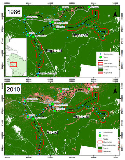 We focus on modeling deforestation risk in a tri-national frontier in the Amazon. More specifically, we study how the recent paving of the Inter-Oceanic Highway influences deforestation in the region where Peru, Brazil, and Bolivia meet, known as the MAP frontier (Madre de Dios, Acre, and Pando). In 2005, Madre de Dios, Acre, and Pando had approximately 94%, 82%, and 97% of forest cover, respectively [20]. We selected two originally unpaved road segments that were almost completely forested in 1986 (i.e., 0.3%–0.6% of the area deforested) and that were relatively far from cities and towns (>10 km). One road segment is located in Madre de Dios, in southeastern Peru, and was paved between 2006 and 2010 (the road segment within the red polygon at left, Figure 2). The other road segment is located in Pando, in northern Bolivia (the road segment within the red polygon at right, Figure 2), a region regarded as the last frontier of intact forest in the Bolivian lowlands [49]. This road segment remained unpaved throughout the entire study period (i.e., 1986–2010).