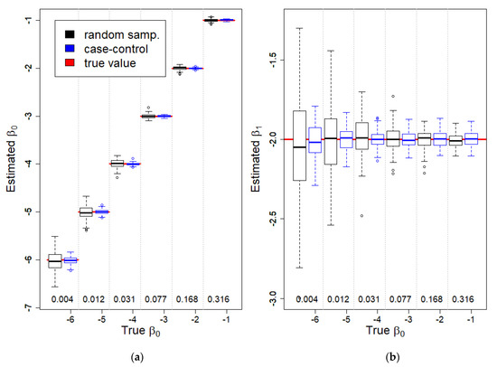where we assumed that and . Different values of were used for each simulated dataset to vary the proportion of cases. The covariate was generated from a uniform distribution between 1 and 1.