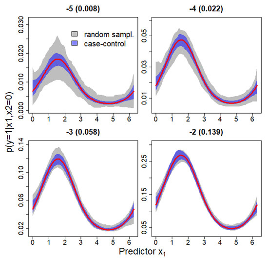 A case-control (CC) approach yielded unbiased and more precise inference on the nonlinear relationship between the probability of the response binary response variable y and the predictor using GAMs. Each panel displays modeling results for data simulated with a particular value of . The number on top of each panel refers to the value for while the proportion of cases prior to sampling is given between parentheses. For each value, grey and blue polygons represent 95% point-wise envelopes based on 100 simulated datasets generated through a random sampling (RS) approach or a CC approach, respectively. The true relationship between and is depicted by the thick red line.