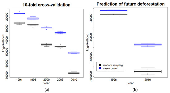 The random forest model fitted using case-control (CC) data and with adjusted probabilities (blue boxes) consistently had better performance when compared to the same model fitted to randomly sampled (RS) data (black boxes). Results from the 10-fold cross-validation exercise and the prediction of future deforestation are shown in panels (a) and (b), respectively. For each year, 10 different models were fitted to 10 different samples from the training data containing 100,000 pixels. Higher values for the log-likelihood indicate better predictive performance.