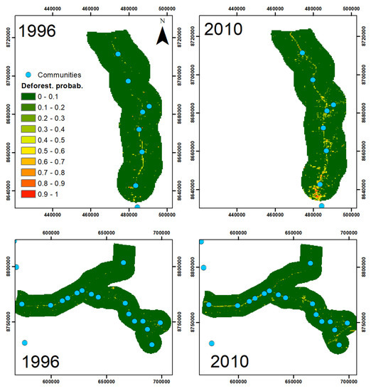 The depiction of the predicted deforestation probabilities reveals a spatially heterogeneous pattern of deforestation probabilities that is not explained by distance to road alone. For example, the random forest model identified substantially increased deforestation risk at the southern edge for the road segment that was paved after 2005, close to the regional capital Puerto Maldonado, a pattern that is particularly evident in the 2010 predictions (top panels in Figure 8). Similarly, for the unpaved road segment (bottom panels in Figure 8), aside from the greater deforestation risk in the immediate vicinity of the road, there was relatively little spatial pattern in 1996 whereas in 2010 there was greater deforestation risk in the southeastern edge of this road segment, close to the town of Puerto Rico and the port town of El Sena.