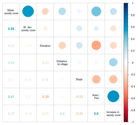 To gain insight into the factors that may promote woody cover increase, the potential woody cover increase and relevant environmental characteristics were correlated (Figure 3). The increase in woody cover within the exclosures between 2017 and 2019 is correlated to a higher mean woody cover, lower elevation level, larger distance from villages, shallower slope, and larger area to perimeter ratio of the exclosures (Spearman’s rank correlation coefficients higher than 0.20). The standard deviation of the woody cover over three years was strongly correlated with the mean woody cover over this same time period, while its correlations with other variables were below 0.20. All maps of the relevant environmental characteristics are added in the Appendix A (Figure A4 up to Figure A7).
