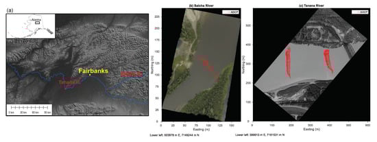 The need for remotely sensed streamflow information is particularly acute in Alaska, which is the largest of the United States in terms of area but remains sparsely gaged []. As part of an ongoing effort to develop robust methods for remote sensing of river discharge, this study focused on two rivers near the city of Fairbanks in central Alaska: the Salcha and Tanana (Figure 1). Basic hydraulic characteristics at the time of data collection are presented in Table 1.