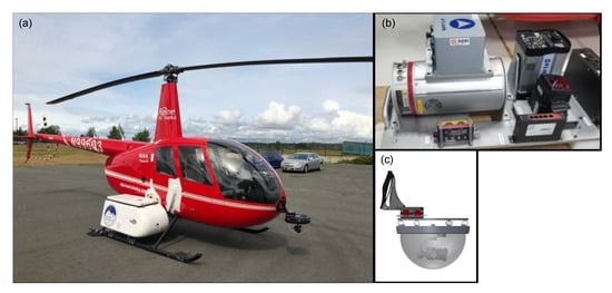(a) The Robinson R44 helicopter used as a platform to acquire hovering image sequences. (b) Instrumentation housed within the pod mounted on the helicopter’s landing gear. (c) Schematic of the mount used to attach the video camera to the nose of the helicopter. Photo in (a) and schematic in (c) courtesy of Dominic Filiano and Adam LeWinter, respectively, of the U.S. Army Corps of Engineers Cold Regions Research and Engineering Laboratory.