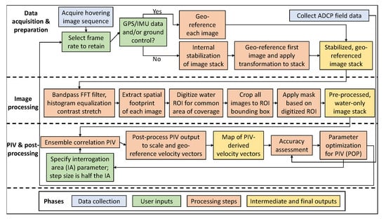 - The general, modular workflow we introduced included an image preparation phase that involved stabilization and geo-referencing, an image processing phase that enhanced the data to facilitate detection and tracking of water surface features such as sediment boil vortices, a PIV analysis phase based on a robust ensemble correlation algorithm, and a postprocessing phase in which the PIV output is scaled, geo-referenced, and compared to field-based velocity measurements for accuracy assessment. Comparison of velocity fields derived from raw and preprocessed images highlighted the importance of image enhancement. This workflow was applied to data acquired from both the digital mapping camera and the video camera and can readily accommodate data from other sensors and platforms.