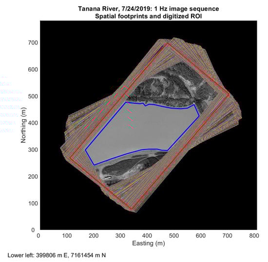 - Next, the actual spatial footprints of each image in the stack are extracted by automatically tracing the perimeter of the nonzero image pixels. These footprints thus are distinct from the nominal bounding boxes of the images, which might include large areas of no data following stabilization and geo-referencing, particularly if the images are rotated (i.e., oriented at an angle rather than being aligned directly east-west or north-south). To illustrate this step, the footprints extracted from a 1 Hz image sequence from the Tanana River are shown as polygons in Figure 4.
