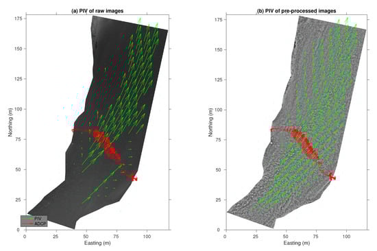 Comparison of PIV-derived velocity vectors derived from (a) raw images and (b) images preprocessed via FIJI. Image pixel size is 10 cm in both cases and the velocity vectors measured in the field with an ADCP are overlain in red for comparison.