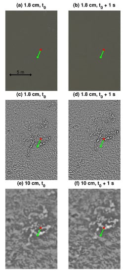 Figure 7 illustrates the importance of using an appropriate pixel size (i.e., resampling the original data) and preprocessing images prior to PIV. In essence, PIV algorithms identify distinctive features expressed at the water surface and track their displacement between successive frames to infer flow velocities. We reproduced this process by visually inspecting the first frame in the 10 cm-pixel image sequence and placing a green dot to mark the location of an easily recognizable feature in the preprocessed image shown in Figure 7e, which is a zoomed-in subset of the enhanced image shown in Figure 5b. In this study, this feature represents a boil of upwelling sediment rather than the floating foam, debris, or seeded particles that have been used in most previous applications of PIV (e.g., []). The location of the boil in the next frame, recorded by the Hasselblad camera 1 s later, is indicated by the red dot in Figure 7f; the length of this displacement vector is 1.99 m, leading to a plausible velocity estimate of 1.99 m/s. The same start and end points were then overlain on the full resolution (1.8 cm pixel) preprocessed images shown in Figure 7c,d, respectively, as well as the original, raw images in Figure 7a,b. The boil we selected as an example was clearly evident in the coarsened, processed image but was harder to distinguish in the preprocessed image with a smaller pixel size due to the greater noise in this sequence; this feature was not apparent at all in the original, unenhanced images. Spatial resampling and image preprocessing thus were critical steps in the PIV workflow in this case.