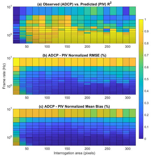 Figure 8 summarizes the results of our parameter optimization analysis via matrices with different IAs on the horizontal axis and various frame rates on the vertical axis. The entries in each matrix represent values of the (a) OP regression , (b) normalized RMSE, and (c) normalized mean bias. Figure 8 indicates that for any IA larger than 64 pixels and any frame rate less than 1 Hz, the OP  value was greater than 0.89. Similarly, these parameter combinations lead to normalized RMSE values less than 11.7% and normalized bias values less than 4.5% of the reach-averaged mean velocity of 1.77 m/s. These results imply that the ensemble correlation PIV algorithm not only provided highly accurate velocity estimates relative to the ADCP data but also was robust to the specific combination of parameters provided as input.