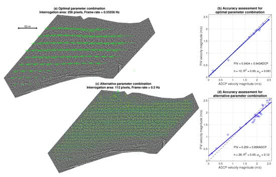 The absolute geo-referencing error did introduce some uncertainty into the comparison of PIV-derived and ADCP-measured velocities we used to assess accuracy and guide parameter selection. However, the PIV- and ADCP-based velocities were only paired with one another at a spatial resolution set by the spacing of the PIV output vectors (see Section 2.5), which is a function of the PIV step size parameter. In this study, the step size was always set to half the IA and so the potential error associated with image geo-referencing only would have been significant for the smallest IAs we considered. For example, for an IA of 256 pixels, the corresponding step size of 128 pixels represented a spatial distance of 19.2 m and a typical geo-referencing error of 4.33 m thus would have been only 22.5% of the spacing between PIV output vectors, implying that an incorrect pairing of an ADCP measurement with a PIV-derived velocity was highly unlikely.