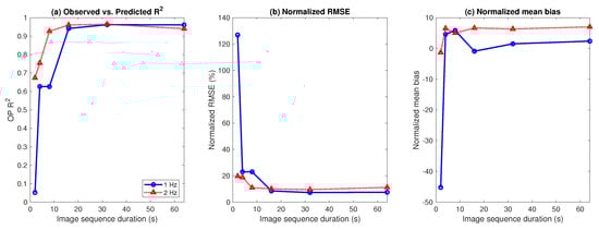 An important practical question in remote sensing of flow velocities is how long a river must be imaged in order to derive reliable velocity information. To address this question, we inspected the POP charts produced for the Tanana River to identify IA/frame rate combinations that yielded strong agreement between PIV estimates and field measurements of velocity. We selected an IA of 128 pixels and held this parameter fixed while varying the duration of the image sequence; six different durations were considered. To account for the potentially confounding effect of the number of images, we evaluated image sequences with frame rates of 1 Hz and 2 Hz and truncated the original, full-length sequences for both frame rates to obtain stacks with durations of 2, 4, 8, 16, 32, and 64 s. For example, the 2 s duration image sequence at a frame rate of 1 Hz consisted of a single pair of images whereas the 2 Hz sequence of the same duration included four images. For each of the six durations, the number of images was equal to the duration for the 1 Hz sequence and the number of images in the 2 Hz sequence was twice the duration. Each of these truncated image sequences was used as input to the ensemble correlation PIV algorithm and the resulting velocity estimates were compared to the ADCP field measurements by computing the various accuracy metrics described in Section 2.5.