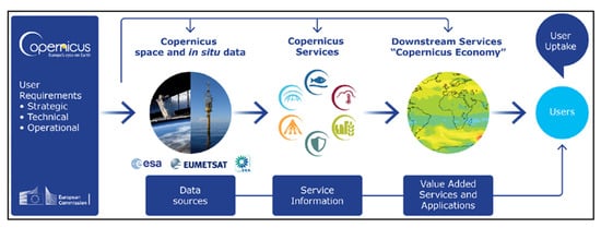 The Copernicus Programme is designed and operates to make available to several public and private user communities trusted and quality multi-source products and services. These products and services are also based on EO data from the Sentinel missions observing land, atmospheric, and oceanographic parameters and in situ monitoring and simulations. They are relevant to facilitate and sustain the implementation of environmental legislation and policies (i.e., policy-driven), to take critical decisions in the event of an emergency, such as a natural disaster or a humanitarian crisis, and to realize societal benefits through improving environmental resource and risk management. Being part of the Copernicus Programme, Sentinel data and derived products are regulated by a free and open access policy that has entailed a significant shift in the current way of thinking about the geo-information market and facilitated the realization of new commercial downstream applications [16]. In addition, the Copernicus Programme is structured to be user-driven (Figure 1). This implies a strong engagement of the institutional, scientific, and industrial communities in a unique and virtuous system. This system should be intrinsically devoted to innovation while aiming at the provision of multifaceted operational Copernicus Services: user-centered design benefits can include “increased productivity, enhanced quality of work, reductions in support and training costs and improved user satisfaction” [26].