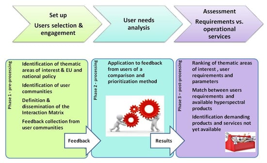 In order to collect the user needs and, consequently, to define the user requirement baseline, a continuous, effective involvement of different users from public and private communities was required within the study. From one side, the involvement of the users from the public communities (including ministries, environmental agencies, and local administrations) was useful to identify needs mainly derived from policy obligations at European, national, and local levels. From the other side, feedback from the private sector community was used to recognize the strategy necessary to improve and advance the market performance. Given the heterogeneity and complexity of the user needs, a scale approach system, based for instance on an objective model [19], should be adopted. Such an approach allows correctly evaluating the user requirements and correctly addressing the technological innovation answer of the hyperspectral sensor. However, in order to improve and strengthen the strategies implemented in previous experiences [19] and support the operational implementation of EU, national, and local policies, a new, standardized methodology to collect, analyze, and prioritize in this framework the user needs and successively identify the service requirements was defined as follows.
