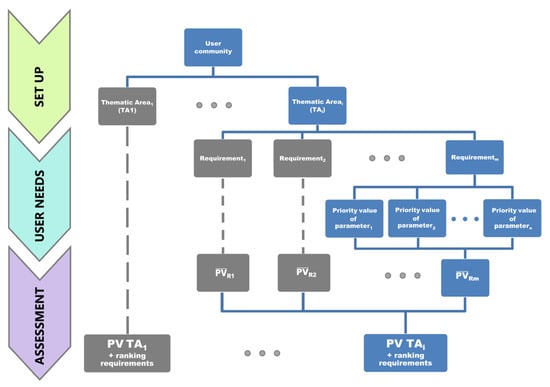 Figure 4 shows the flow chart of the user requirement assessment. The assessment was conducted per user community by evaluating the priority value of each thematic area (referred to as PV TA, from 1 to i, in Figure 4) by means of the averaged priority values assigned to the related requirements (e.g., R1, …, Rm for TAi in Figure 4). These averaged priority values were also used to produce a ranking of the requirements within each thematic area. The assessment at the user community level had a twofold goal: to compare and contrast the needs for each thematic area, and to identify those parameters that are more helpful to solve the user problem or to achieve the user task. In addition, this analysis allowed pointing out similarities among user communities in terms of requirements and parameters, even if evaluated with different priority values. The graphical method chosen to represent here the results of feedback analysis is the Sankey diagram, which is a flow diagram that relates entities through lines whose thickness expresses the quantitative relationship between them. This diagram is particularly suited to highlight and assess the priorities given by user communities to requirements and parameters, as in the case of the analysis of remote sensing indices suitable at monitoring green infrastructures for natural water retention measures [17].