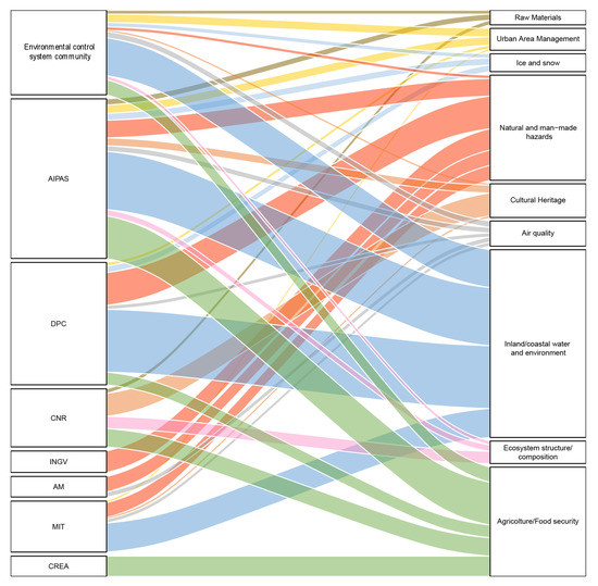 The other communities involved have instead interest only in specific Copernicus application domains. Hence, their feedback covered only some of the thematic areas investigated, as for instance in the case of the Italian Ministry of Infrastructures and Transport (MIT), which expressed its interest only for “IC”, “AQ”, “CH”, “NH”, and “UM” areas. However, the interest provided by MIT took into account also feedback from the Italian Civil Aviation Authority (ENAC), concerning technical regulation, certification, surveillance, and oversight in the civil aviation field, and from Rete Ferroviaria Italiana (RFI), the company of the Ferrovie dello Stato Italiane Group, concerning the rail traffic on the national network, track, stations, and installations (Table 4). In other cases, the feedback highlighted interest only in just one thematic area. This is the case of CREA, the Italian research organization with competence within the fields of agriculture, agro-industry, food, fishery, and forestry, which provided requirements only for “AF”. This happens also for the Italian Air Force Meteorological Service (AM), which gave feedback only for “AQ” given its role in providing meteorological services for military tasks as well as for civil protection, including daily weather forecasts.