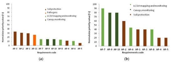 As one of the most involving results, we have highlighted the interest provided by the Environmental control system community and CREA to the “AF” thematic areas (see Table A1 in Appendix A for a detailed description of the “AF” requirements and parameters). This thematic area is exemplary to illustrate how two communities with different institutional mandates have similar needs related to “AF” but with different priorities (Figure 6). Both user communities provided feedback on (almost) all the identified requirements. However, the Environmental control system community expressed a quite uniform interest for all the requirements, with a slight preference (ca. 30%) for those requirements linked with soil protection (from AF-1 to AF-3) and pathogens (AF-11), whereas CREA showed a greater preference (80%–90%) for the requirements associated with land-use and land-cover mapping and monitoring (AF-7) and canopy monitoring (from AF-9 to AF-10).