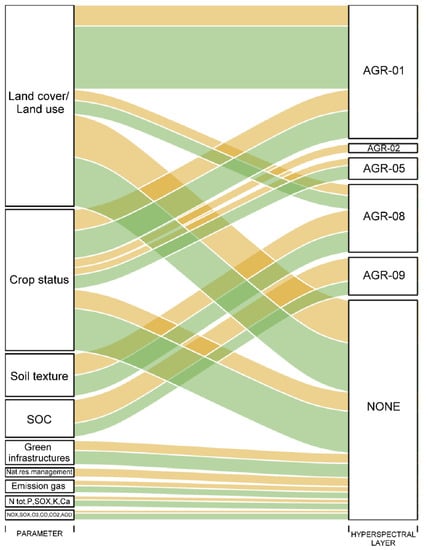Sankey diagram representing the link between required parameters (left hand side column) and available layers from hyperspectral sensor data related to the “AF” thematic area (AGR-xx), as requested by the Environmental control system community (reported in spicy mustard) and CREA (reported in green). The thickness of each connecting line represents the number of times the parameter is requested by the considered community to satisfy the user requirement. Layer coding was defined within the study as an alphanumeric and unambiguous code for each product. The code “NONE” indicates an unavailable hyperspectral layer.