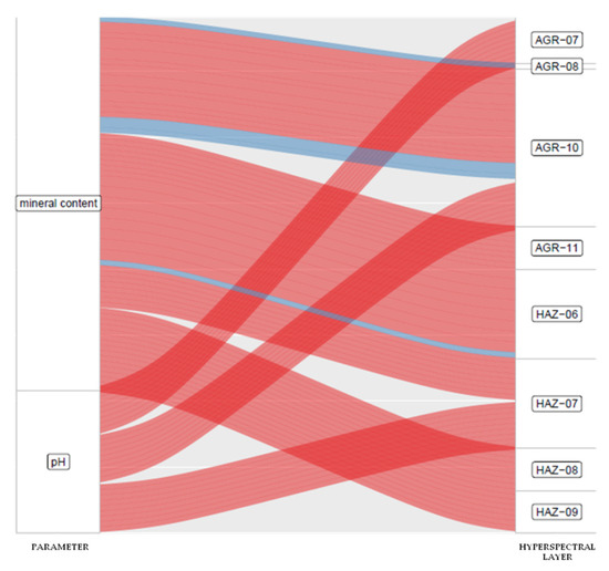 Another thematic area presented here is “RM”, for which significant economic and environmental challenges for private and public users (mining industry, research entities and environmental management community) have been recognized [147,148]. Figure 8 reports the Sankey diagram of the match between the required parameters and the hyperspectral layers for the “RM” thematic area. The user requirements concern the identification of the soil surface composition and the presence and/or the abundance of specific minerals. The required parameters, namely the mineral content and the acid pH, could be solved by layers already available which have the following spectrally diagnostic features: iron oxides; clay minerals; carbonates; sulfates and phosphates; pyrite oxidation products; and red mud pollution (ferrous, aluminum, and silicon oxides) to distinguish raw materials from other bare soils and materials.