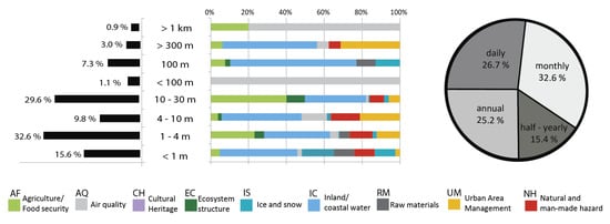 The user communities also specified for each parameter the expected spatial and temporal resolutions. Figure 11 shows an overview of these analyses and highlights that most of the users are expecting a resolution comprised between 1–4 m and 10–30 m with a monthly revisit time.