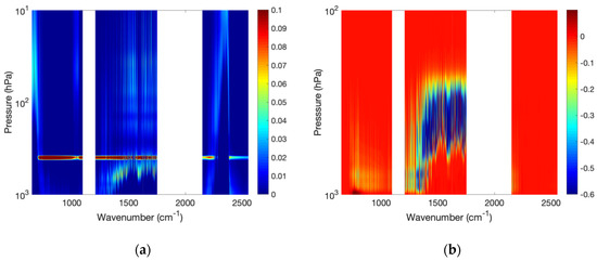 Allen and Tett [13] pointed out the challenge of quantifying the uncertainty covariance in optimal fingerprinting. Previous simulation-based studies characterize the uncertainty based on the radiative kernels and the natural variability from climate models or Observing System Simulation Experiments (OSSEs) [20,21,24,25,27]. Estimation for the fingerprinting residual term and covariance depends on the choice of radiative kernel and the space and time scale used to obtain and . is constructed using forward radiative transfer model simulations. Instrument dependent measurement errors and potential forward model errors such as errors in molecular spectroscopy of atmospheric species and cloud modelling have to be accommodated in to ensure the consistency between and for fingerprinting applications using real data. Details about the construction and validation of and from real observation data of CrIS and AIRS and the accommodation for measurement difference between CrIS and AIRS are going to be discussed in this paper.