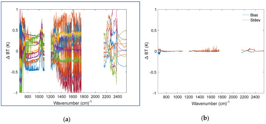 (a) Monthly mean CrIS spectral anomalies over the tropical ocean region (latitude −30°~30°) of year 2016; (b) Difference between the PCRTM retrieved monthly mean CrIS spectral anomaly over the tropical region (latitude −30°~30°, year 2016–year 2017) and the satellite measured monthly mean CrIS spectral anomaly (Figure 1). Blue curve—the mean value of the difference of twelve months; Red curve—the corresponding standard deviation value.