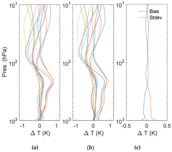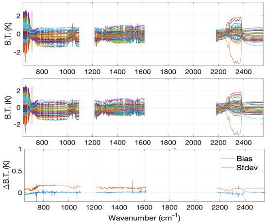 The “retrieve-then-average” approach was used by the AIRS team to develop Level 3 gridded data products to facilitate climate and trending studies [4]. Level 3 products are the spatial and temporal averages of Level 2 products [5]. Operational Level 2 products for hyperspectral sounder missions like AIRS and CrIS are obtained via iterative physical retrieval processes [5,6,7,8]. Smith et al. [9] used the “retrieve-then-average” approach to investigate systematic differences in climate scale temperature records derived from AIRS, CrIS, and IASI spectra. The dual-regression (DR) retrieval method [10,11] was used to obtain instantaneous temperature profiles. Compared to a physical retrieval method, DR greatly reduces the computational cost by avoiding forward radiative transfer calculations in the retrieval process. However, physically-based algorithms can yield averaging kernels needed for error analysis and ensure a better radiometric consistency by finding solutions that fit OLR spectra.